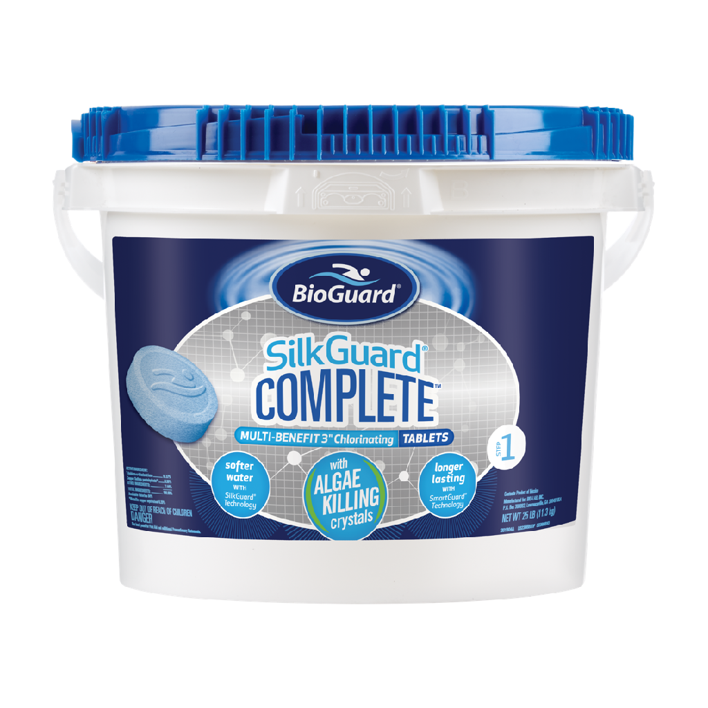 BioGuard SilkGuard Complete Multi-Benefit 3 Inch Chlorinating Tablets are a revolutionary product exclusive to BioGuard. These chlorine tablets differ from traditional chlorine because the SilkGuard Technology actually softens the water by attaching to hard water components and metal surfaces, which protects your pool surface and equipment from scale, corrosion and staining, all while killing bacteria. SunShield Technology offers protection from the sunlight while the SmartGuard Technology helps the tablets last longer than traditional chlorine tablets. This tablet can be used in a skimmer, feeder, or floater. Last but not least Algae killing crystals help stop algae before it starts.