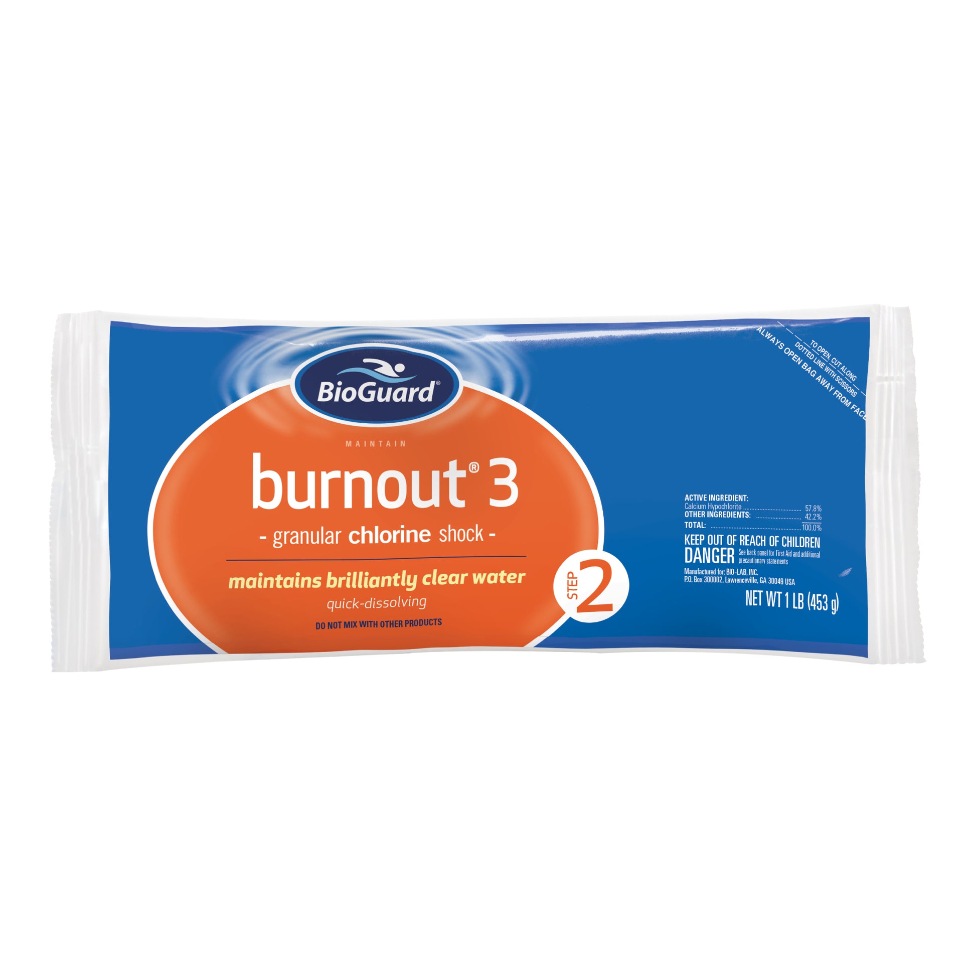 BioGuard Burnout 3 is a high-powered chlorine shock that will quickly kill off any bacteria or other organic contaminants, restoring your pool water to clarity and health. Its quick-dissolving granular formula can be added directly to pool water without messy pre-dissolving, making application easy and hassle-free. It is designed specifically to work safely in vinyl and plaster pools without fear of bleaching, and is also compatible with chlorine and bromine sanitizers. Best of all, Burn Out 3 is made to the exacting standards BioGuard demands of all its products, allowing you to buy with confidence.