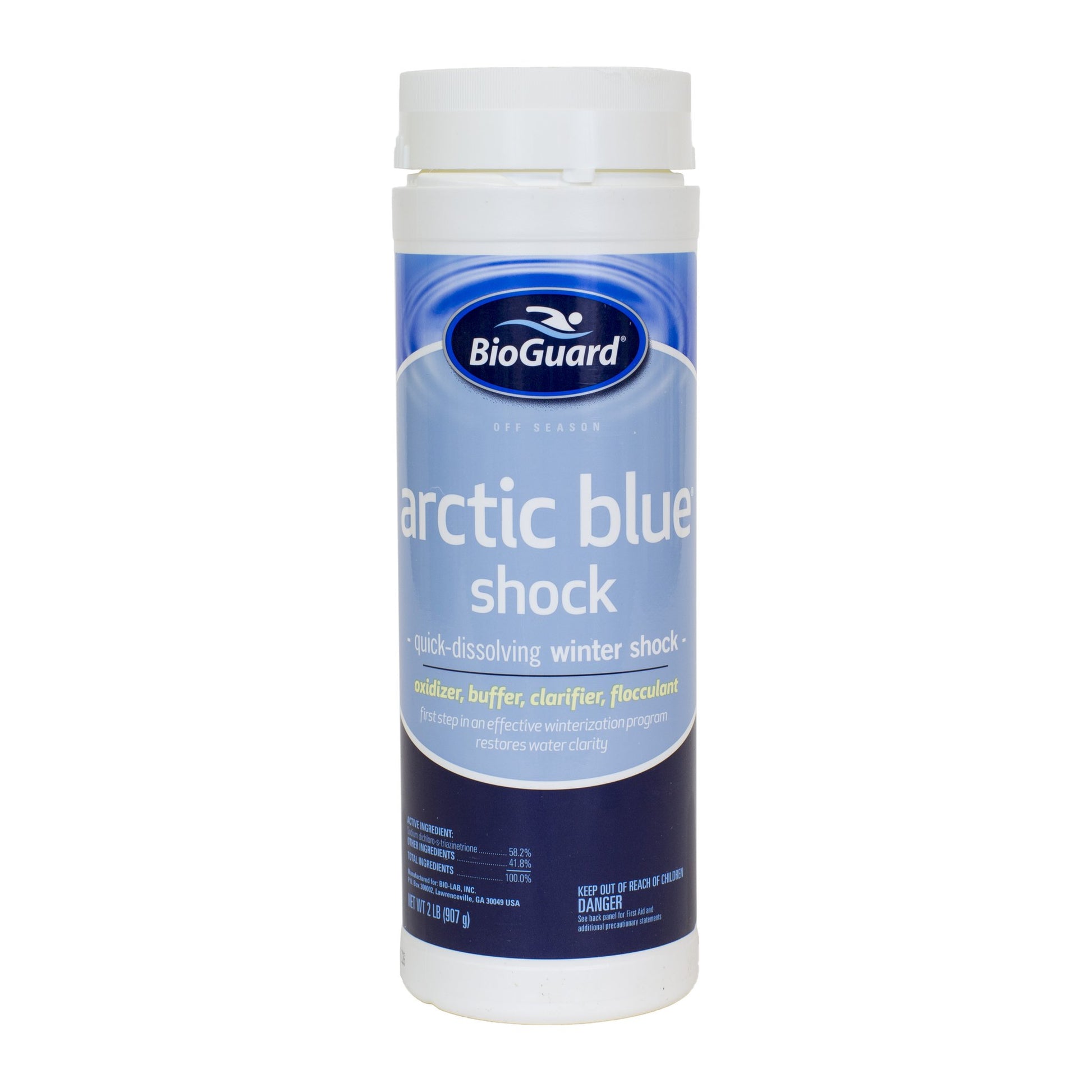 - Arctic Blue Shock oxidizes and clarifies the pool water through the off-season and is ideal for all types of pool surfaces.