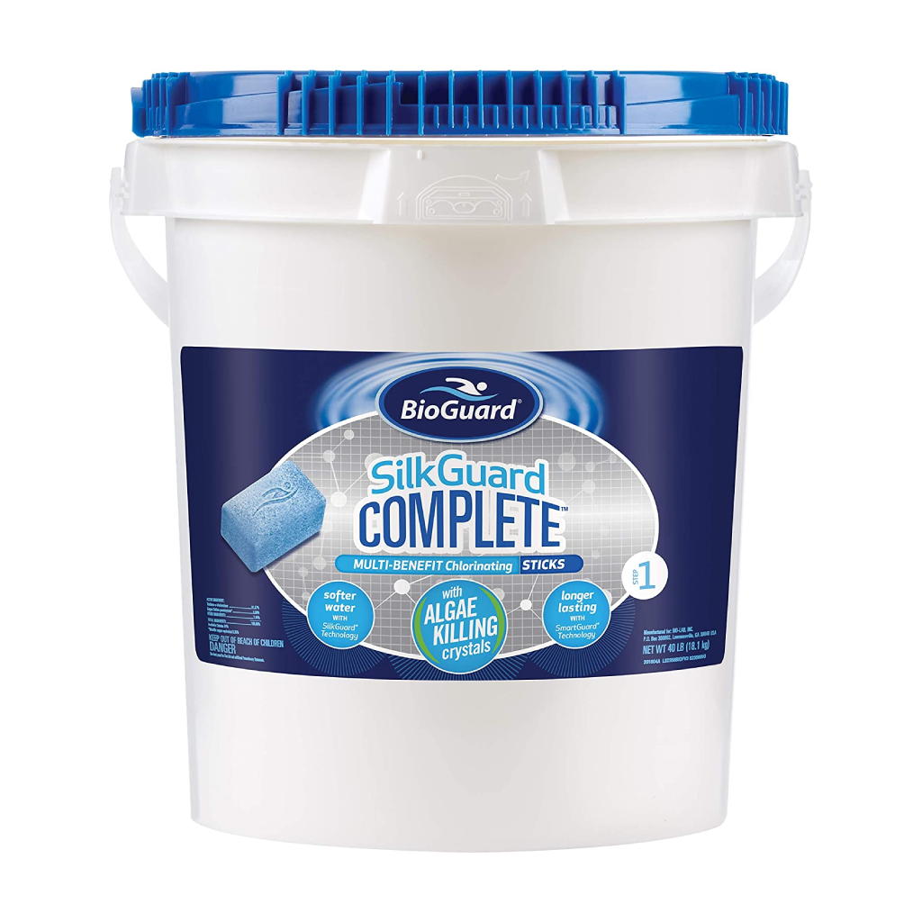 BioGuard SilkGuard Complete Multi-Benefit Chlorinating Sticks are a revolutionary product exclusive to BioGuard. These chlorine sticks differ from traditional chlorine because the SilkGuard Technology actually softens the water by attaching to hard water components and metal surfaces, which protects your pool surface and equipment from scale, corrosion and staining, all while killing bacteria. SunShield Technology offers protection from the sunlight while the SmartGuard Technology helps the tablets last longer than traditional chlorine tablets. Last but not least Algae killing crystals help stop algae before it starts.